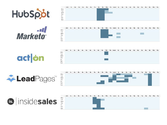 In the below Communication Profiles from the Seventh Sense platform, it's clear that Hubspot tends to send their blog notifications between 8:45AM and 9:45AM seven days a week, Marketo between 9:45 and 10:45 during the work week, Act-On between 10:00AM to 11:00AM (I unsubscribed quickly as I didn't have much appreciation for their content, which is why they don't have much data) and Insidesales.com between 7:30AM and 9:00AM. Please note that these are all Eastern time zone, so these times would be even earlier for Central and West Coast individuals.