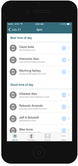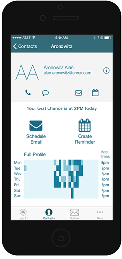 All in one meta-tool for mobile sales reps. You can now see the most optimal time to reach out to every individual contact you have, create reminders with one easy touch (no more swerving while driving), schedule emails to be delivered at the most optimal time and make phone calls right out of the app.